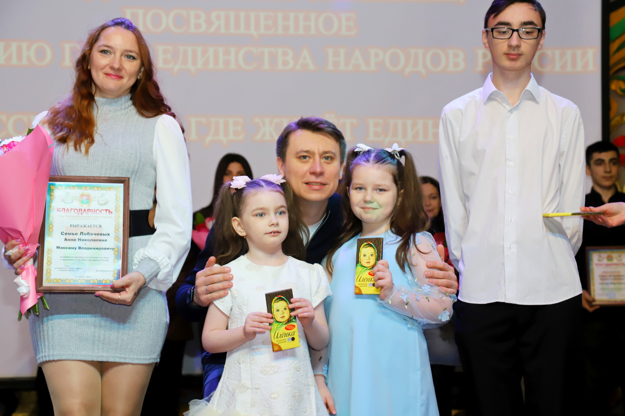 Почётными грамотами главы администрации Суворовского района отмечены семьи: Дмитрия и Юлии Кондрашовых, Алика и Стеллы Акобян, Сергея и Юлии Воробьёвых, Григора и Лианны Оганисян, Максима и Анны Лобачёвых, Бехруза и Данохон Каратаевых.