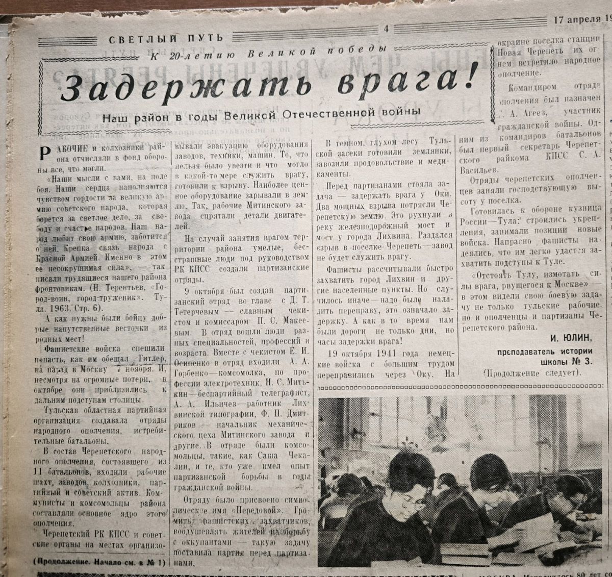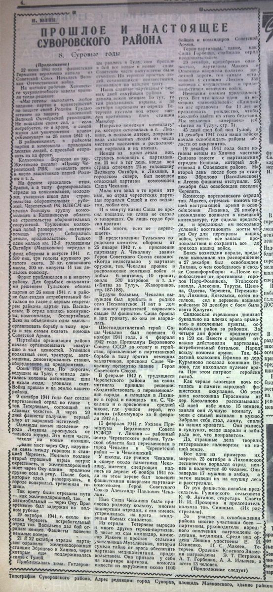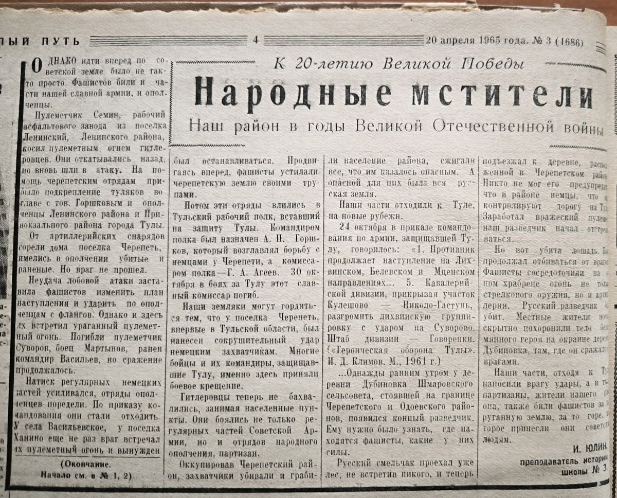 ««Отстоять Тулу, измотать силы врага, рвущегося к Москве» - в этом видели свою боевую задачу не только тульские рабочие, но и ополченцы и партизаны Черепетского района», - пишет газета «Светлый путь» в апреле 1965 года.
